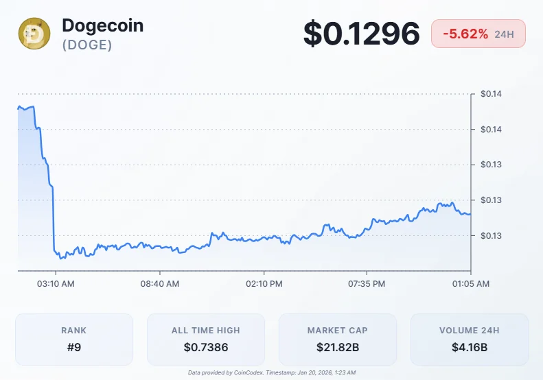 At the time of writing, DOGE trades at around $0.1296, down 5.62% in the last 24 hours.