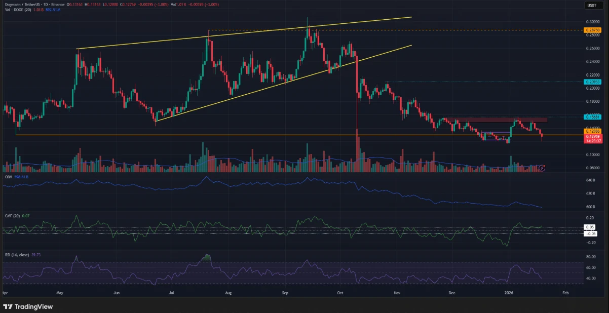 Technical indicators paint a concerning picture for DOGE supporters. While the Chaikin Money Flow remained above +0.05 at press time, the On-Balance Volume indicator shows persistent seller dominance dating back to October. The memecoin surrendered the $0.129 low from April 2025, confirming that bears have regained control of this support level.
