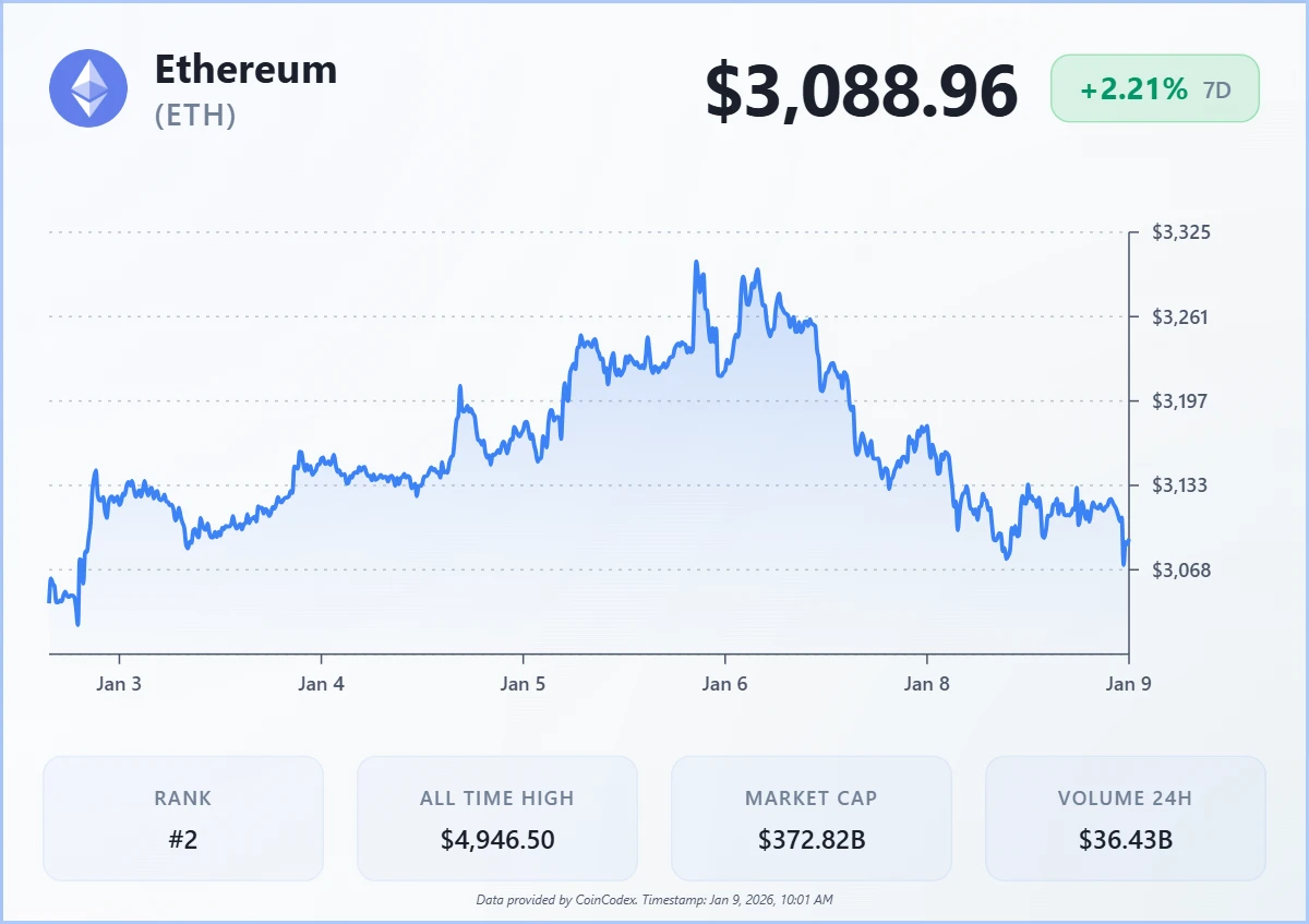 Ethereum trades around $3,088, up 2.54% in the last 7 days, as analysts release aggressive price forecasts for 2026. ETH closed 2025 near $2,970 after a volatile quarter, leaving the market divided.