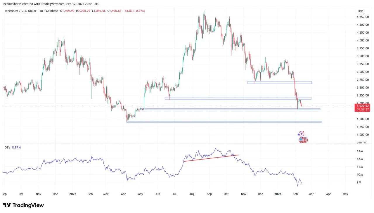IncomeSharks wrote on X that even as a long-term bull, he does not see a reason to re-enter yet. He added that if Bitcoin already broke the April lows, Ethereum may follow and eventually revisit its own April base. In this context, the chart highlights a deeper demand band near the mid-$1,400s to $1,600s range as the next major area of interest if the current floor fails, while the near-term path stays defined by lower highs and failed reclaim attempts.