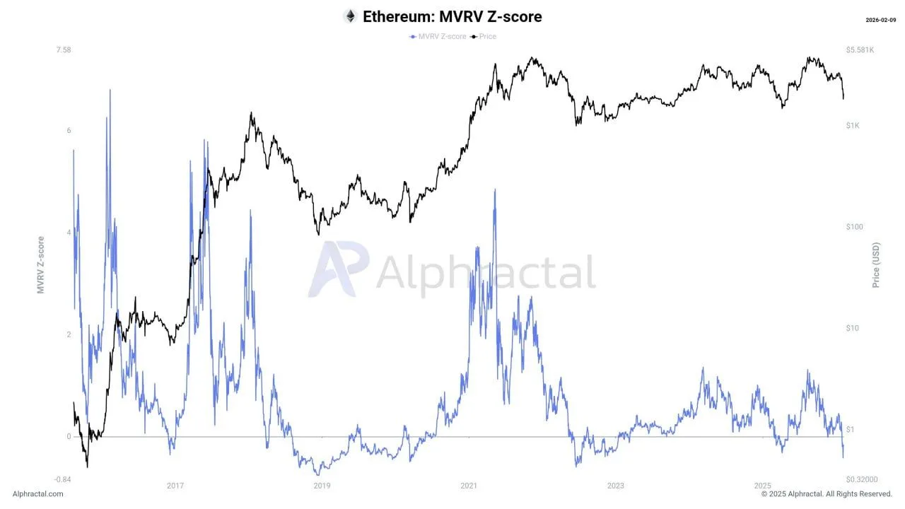 Ethereum’s MVRV Z score has dropped into a “capitulation zone,” according to analyst Joao Wedson, who shared an Alphafractal chart dated Feb. 9. The chart tracks Ethereum’s price in black and the MVRV Z score in blue, a measure that compares market value to realized value and then standardizes the gap.