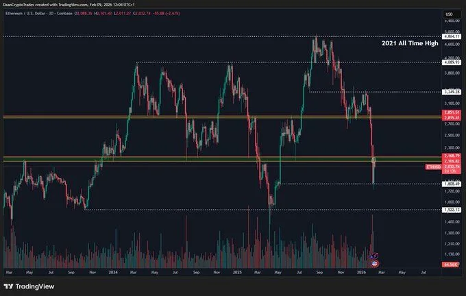 Daan Crypto Trades framed the $2.1K line as the near term decision point. If price retakes that level and holds, the move would support the idea that the drop reset the range rather than breaking it, while a failure to reclaim it would keep the rebound fragile and leave ETH trading under a level the market has repeatedly treated as a pivot.