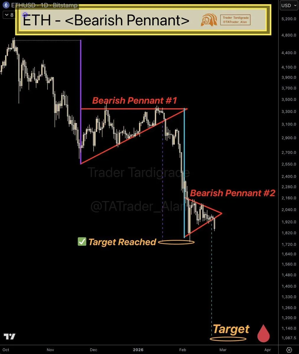 Chart analysts continued to monitor Ethereum’s trend as new patterns formed on the daily chart. Trader Tardigrade said that a second bearish pennant has now broken down and that it shows a measured move toward the $1,072 area.