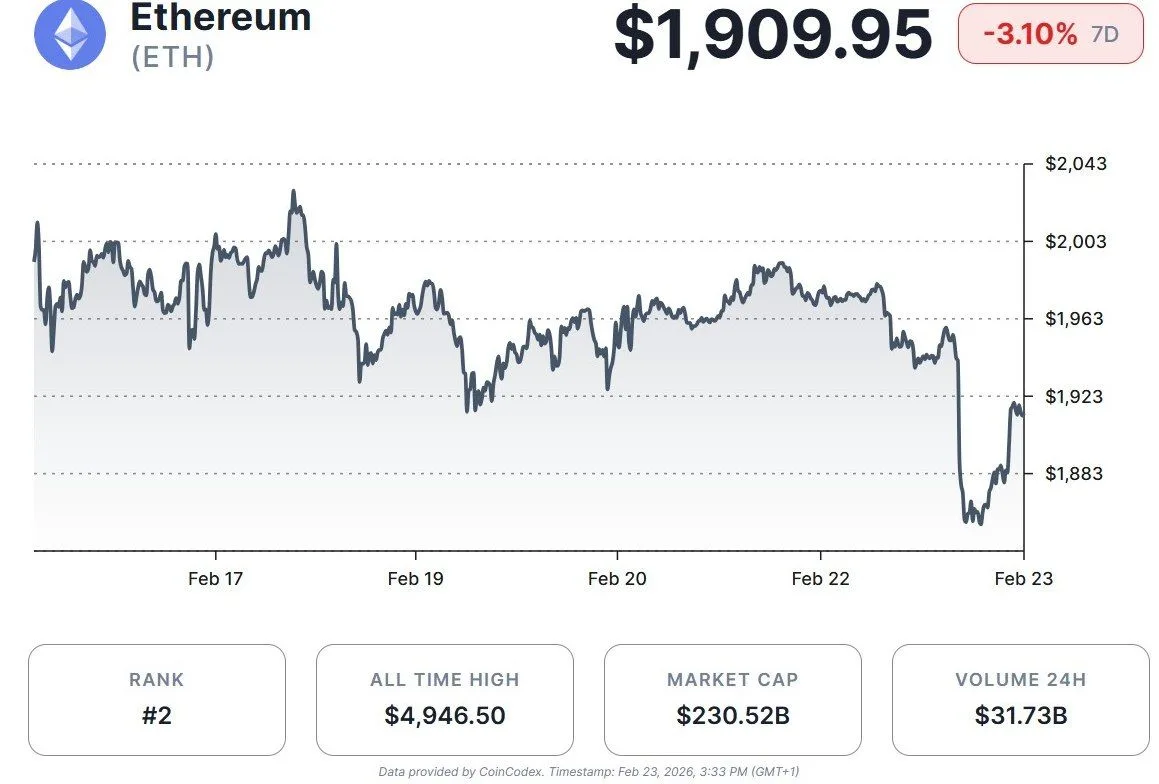 ETH traded near $1,900 during the latest update window. That level followed a daily drop of more than 3.5%, with weekly losses near 5% and monthly losses at 30%.