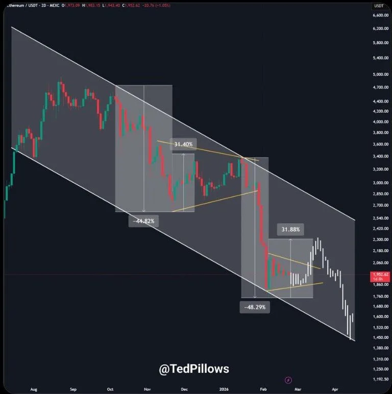 In Q4 2025, ETH posted a roughly 31% relief rally within the broader downtrend before sliding nearly 48% to the lower boundary of the channel. The present move shows a comparable 31% rebound, followed by another breakdown toward channel support. The repeated pattern of lower highs, compressed consolidation, and accelerated sell-offs strengthens the fractal comparison.