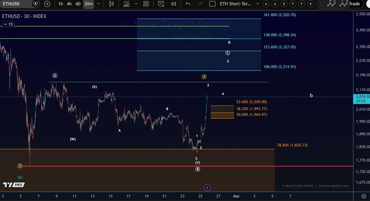 Ether traded near $1,955 on the ETHUSD 30 minute chart after a rebound that the analyst behind Man of Bitcoin called uneven. In a post on X, the account said it reads the move as “wave c of 3” and set an “ideal” upside target near $1,979.