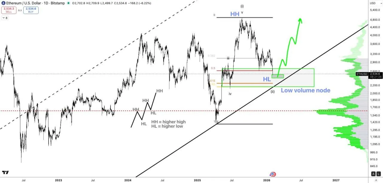 Ethereum extended its pullback on the daily chart, trading near $2,535 after a sharp red candle that showed a roughly 6% session drop on the Bitstamp feed. The chart still frames the move as a retracement from the August 2025 peak near $5,000, which some analysts label as the cycle’s latest higher high.