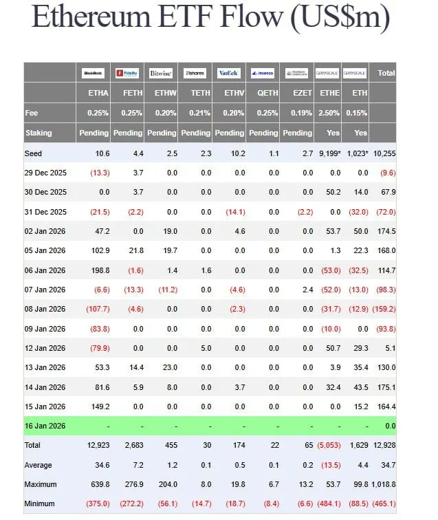 Ethereum spot exchange traded funds recorded about $164 million in net inflows on Jan. 15, according to daily flow data across major U.S. issuers. The gains marked one of the stronger single day inflow totals this month, driven mainly by BlackRock’s ETHA, which added roughly $149 million, while Grayscale’s ETH product contributed about $15 million. Most other listed Ethereum ETFs reported flat activity during the session, showing that inflows remained concentrated in a small number of funds.