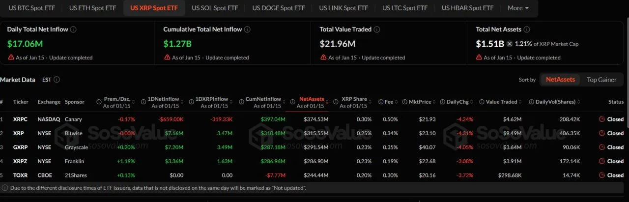 Meanwhile, U.S. spot XRP exchange traded funds recorded $17.06 million in net inflows on Jan. 15, according to market data tracking daily fund activity. The inflows lifted cumulative net inflows to about $1.27 billion, while total net assets across XRP ETFs reached roughly $1.51 billion, representing about 1.21% of XRP’s market capitalization. Trading activity remained moderate, with total value traded near $22 million during the session.