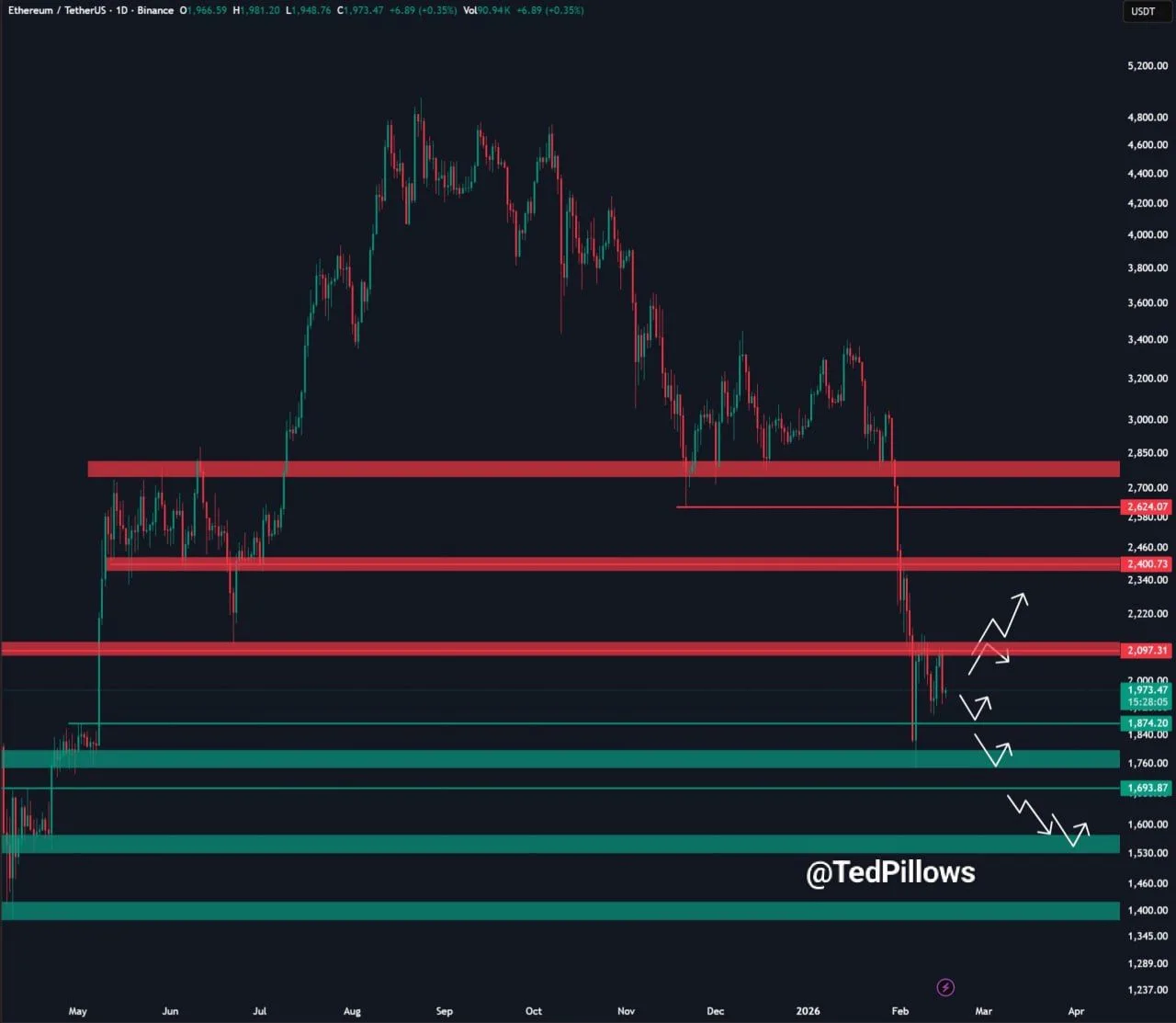 The chart also mapped several nearby zones where price has reacted in the past, with price action clustering around the low $2,000s after the breakdown. TedPillows noted that short term price moves have turned volatile around these levels as selling pressure continued. The TradingView image placed ETH near $1,973 at the time of the snapshot, reflecting the latest push below the round number threshold.