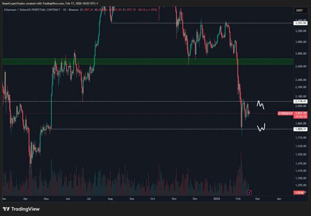 Market watcher Daan Crypto Trades said ETH stayed “within this $1.8K–$2.1K range,” with no clear short term breakout while price “hover[ed] around this $2K region,” according to a post on X.
