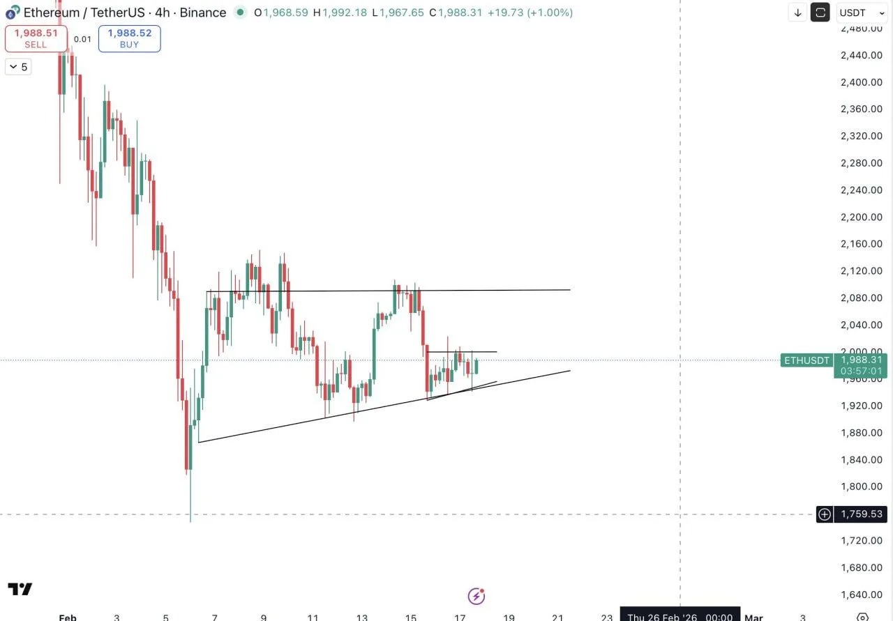 Ethereum traded near $1,977 on Feb. 17 on a daily Binance ETHUSDT perpetual chart, as price held inside a tight band around the $2,000 level after a sharp selloff earlier in the month.