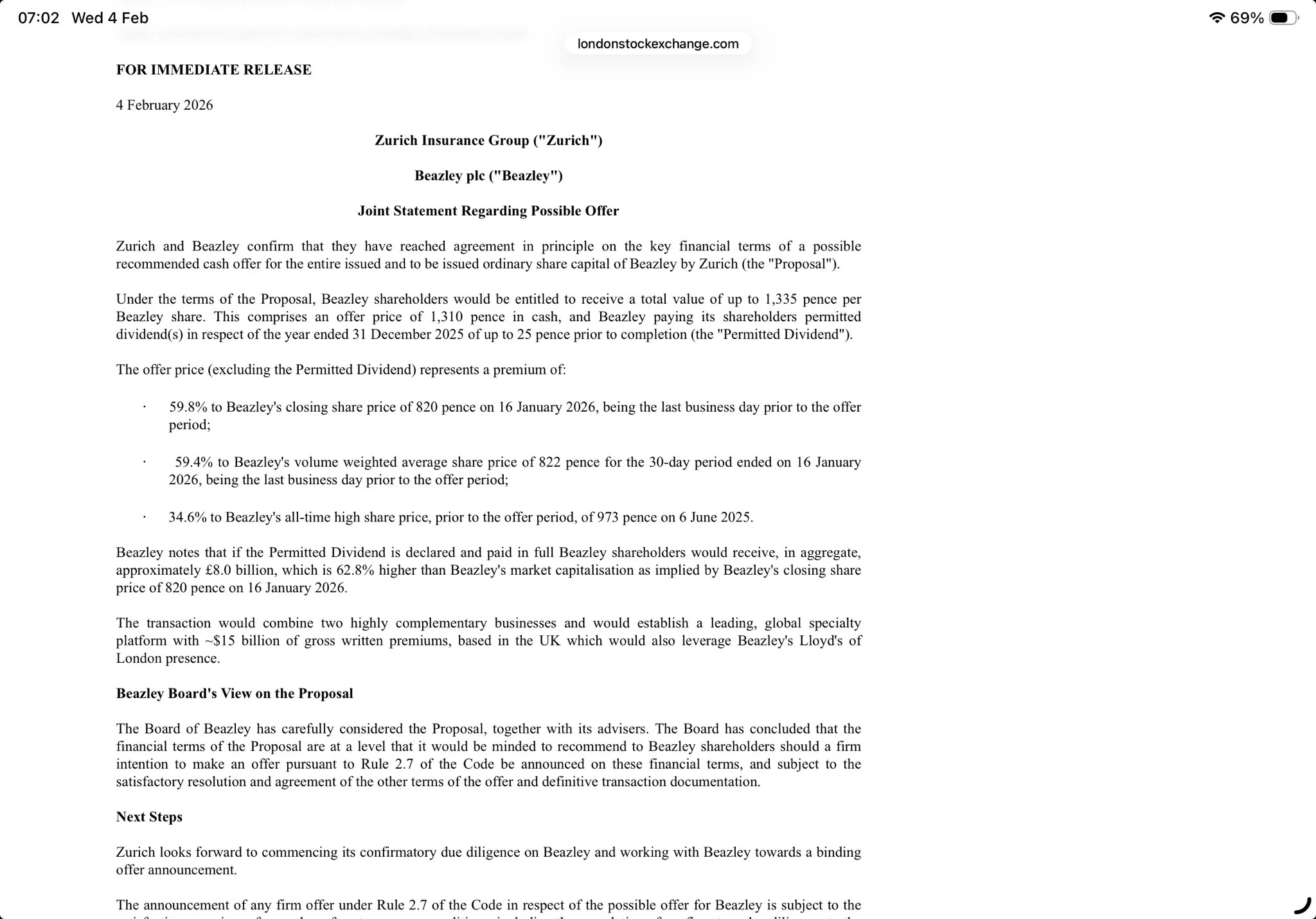 Both firms said the deal would create a global specialty insurance platform with roughly £15 billion in gross written premiums. Beazley’s board signaled its intention to recommend the offer if Zurich confirms a firm bid. Zurich has until February 16 to make a binding announcement.
