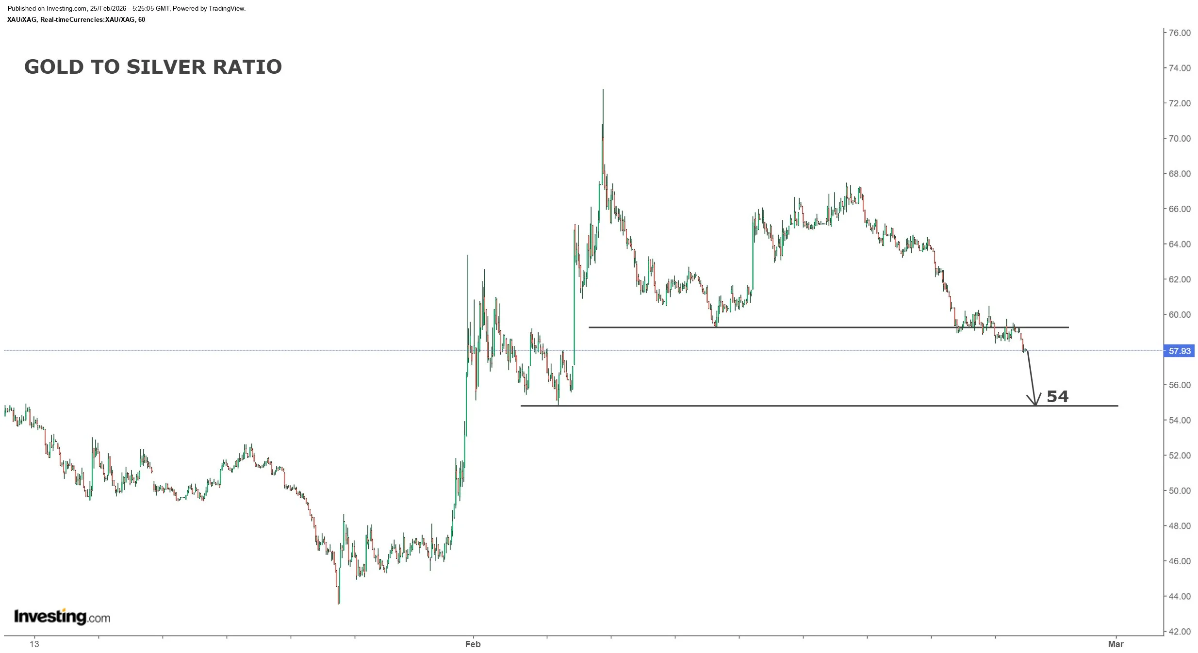 From a technical perspective, the gold-to-silver ratio has lost prior support and now trends toward the 54 level. Analysts observe that with gold near $5,186 and the ratio at 59, a retest of the broken support may precede another move lower.