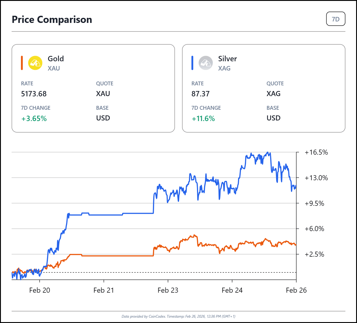 The broader macro backdrop adds complexity. Gold still trades near record territory after reaching an all-time high of $5,591 earlier. Silver remains below its historical peaks but continues to close the gap.