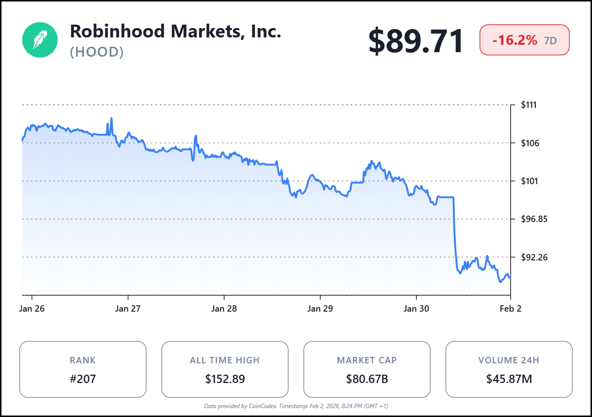 The move leaves Robinhood trading near $91, far below its record high of $152.46 set last October.
