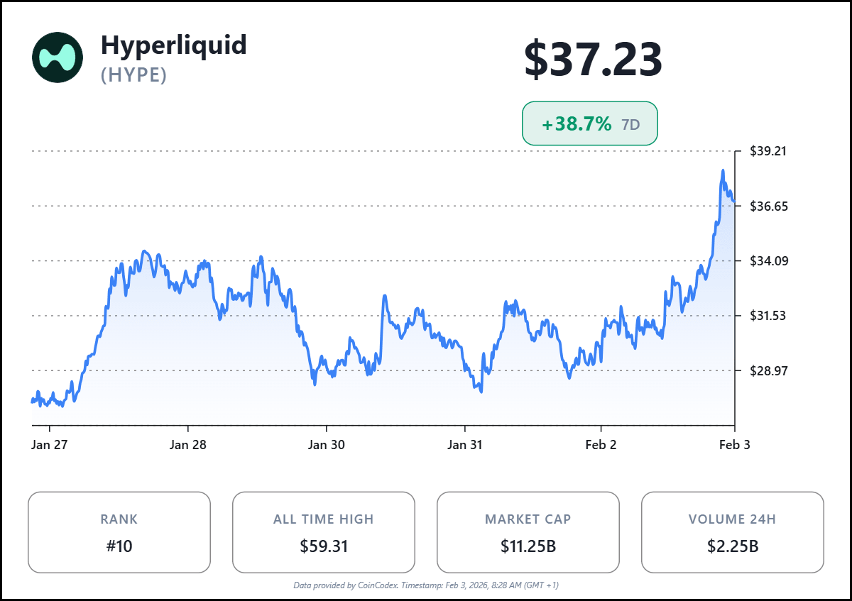 Despite broader market stress, HYPE’s performance stands out. Reports highlight its position as one of the weekly market winners among major crypto tokens, contrasting with downward pressure seen in many other assets.