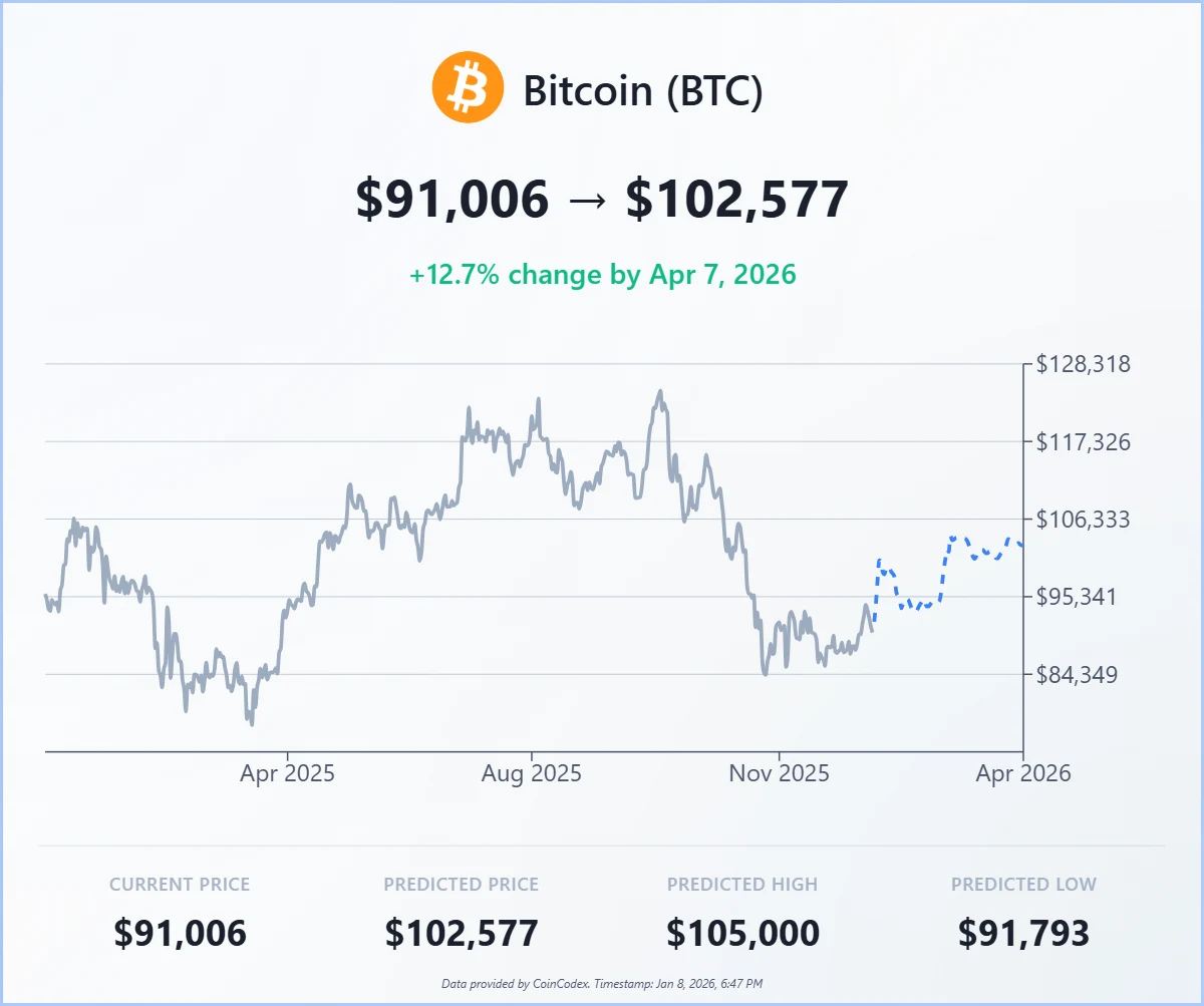 CoinCodex data shows Bitcoin entering a stabilization phase after the sharp selloff seen in late 2025. The projected path on the chart points to BTC holding above the mid-$80,000 range, followed by a gradual move back toward the low-to-mid $90,000 area as January 2026 unfolds. The model reflects cooling momentum after the November decline rather than a rapid reversal.