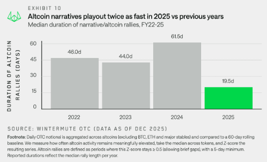 One stat stands out: the median altcoin rally in 2025 lasted only 19 days, a massive drop from prior years. Money simply isn’t waiting around in high-risk environments anymore. It demands secure, established infrastructure and moves quickly to quality.