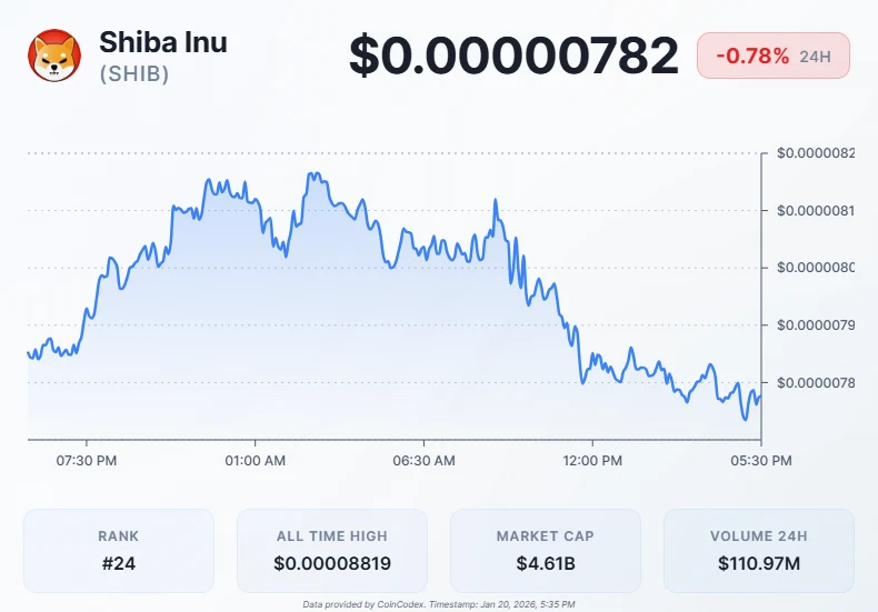 A subsequent 3.41% decline erased recovery progress. At the time of writing, the meme coin trades at around $0.00000782, down 0.78% over the last 24 hours.