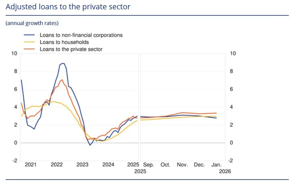 Meanwhile, broader credit data shows that adjusted loans to households held steady at 3.0% year over year. Loans to non-financial corporations slowed slightly to 2.8% from 3.0% in December.