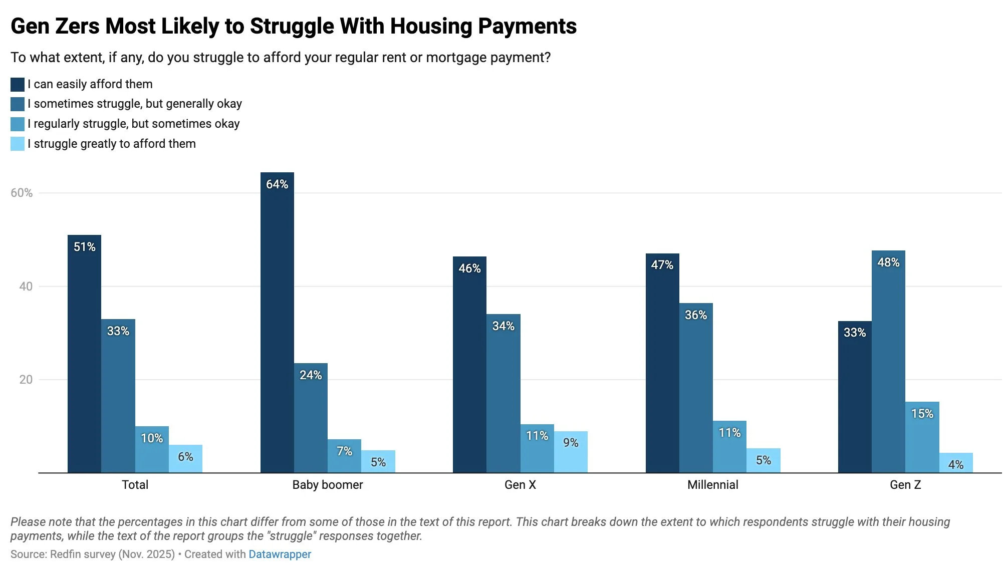 Home prices remain slightly higher than a year ago, and economic uncertainty continues to weigh on consumers. A recent survey shows that roughly 49% of US residents struggle to afford their regular rent or mortgage payments. With Gen Z likely to struggle the most. That statistic highlights ongoing financial pressure despite easing borrowing costs.