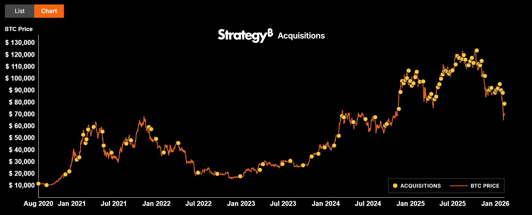 Michael Saylor declared that Strategy “will purchase Bitcoin every quarter,” doubling down on the firm’s conviction in BTC as a superior store of value. This commitment arrives amid Bitcoin’s recent slide below $70,000, extending from highs near $126,000 in late 2025. The latest buy added 1,142 BTC for $90 million at an average of $78,800 per coin, swelling holdings to 714,644 BTC, roughly 3.4% of Bitcoin’s circulating supply.