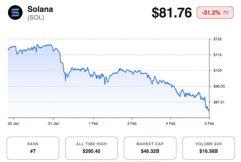 Despite infrastructure progress, Solana’s token price weakened sharply. SOL traded near $86.73, posting steep daily and weekly declines. According to Dami-Defi, the loss of a two-year uptrend signals structural risk.