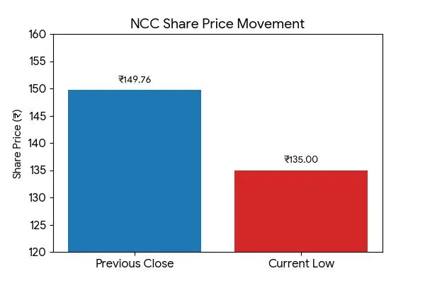 NCC hit a low of ₹135, down by nearly 10% from the previous close of ₹149.76. The stock later regained some of the losses and is now changing hands for ₹148.34, down by 0.95%.