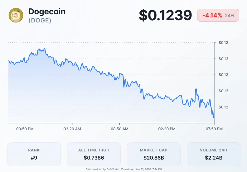 Dogecoin’s price showed no immediate reaction to the Such app announcement. At the time of writing, Dogecoin trades at approximately $0.1239, down 4.14% in the previous 24 hours.