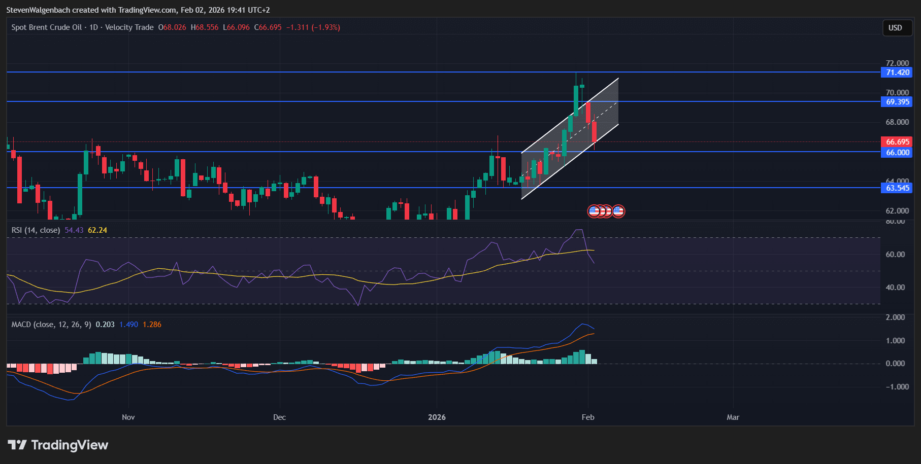 Conversely, a rebound from the $66 support level may lead to a continuation of the bullish trend seen in the past week. This could lead to BRENT challenging the $69.395 resistance level before a possible climb to as high as $71.420 in an extreme case.