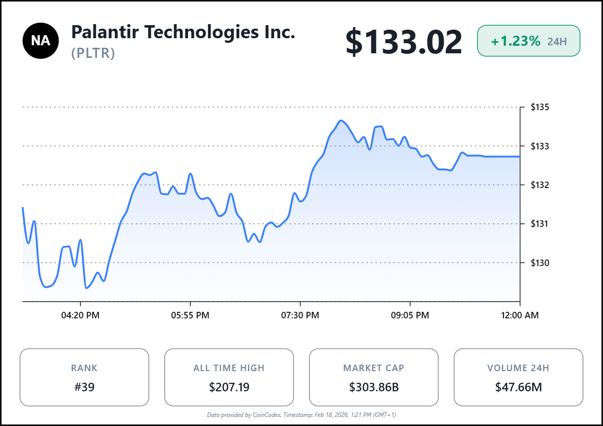 Palantir Technologies Inc. (PLTR) closed at $133.02, up 1.23%, and climbed further to $136.06 in pre-market trading, as investors reacted to news of its headquarters relocation. The stock trades within a 52-week range of $72.50 to $207.19, while it remains roughly 25% lower year-to-date amid a broader software sector pullback.