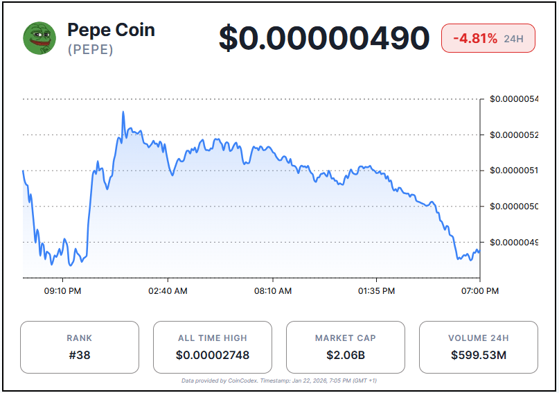 PEPE’s price has declined by 4.81% over the past 24 hours, currently trading around $0.00000490. The daily price range has fluctuated between $0.000004847 and $0.000005314, indicating some intraday volatility.