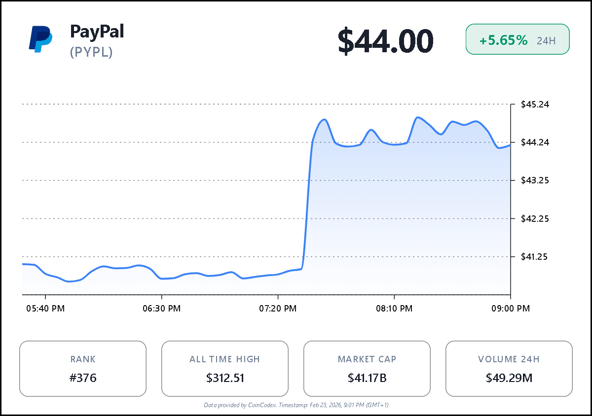 PayPal trades at $44.00 as of writing, up 5.65% in the last 24 hours after surging as much as 9% intraday. The stock briefly halted trading due to volatility, with prices ranging between $40.85 and $45.23 during the session.