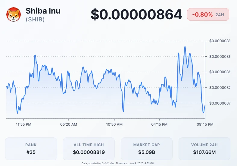 The cryptocurrency was trading at $0.00000864 at press time, representing a 0.80% decline in the last 24 hours. SHIB climbed from a daily low of $0.000008499 to a peak of $0.00008827 during the session.