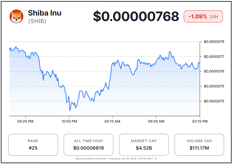 At the time of writing, SHIB trades at around $0.00000768, down 1.09% in the last 24 hours.