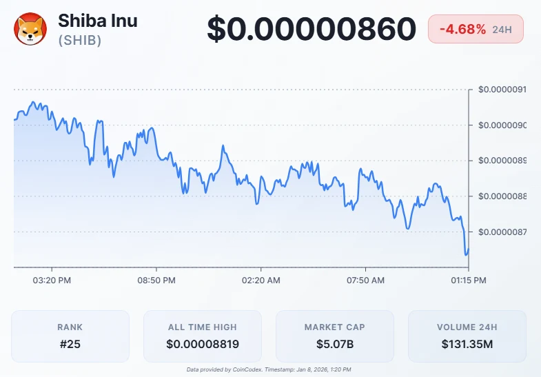 Shiba Inu has surrendered most of its early-year momentum as the cryptocurrency market settles into its 2025 trading pattern. The meme coin now trades at price points that closely mirror its structure before the December holiday period.