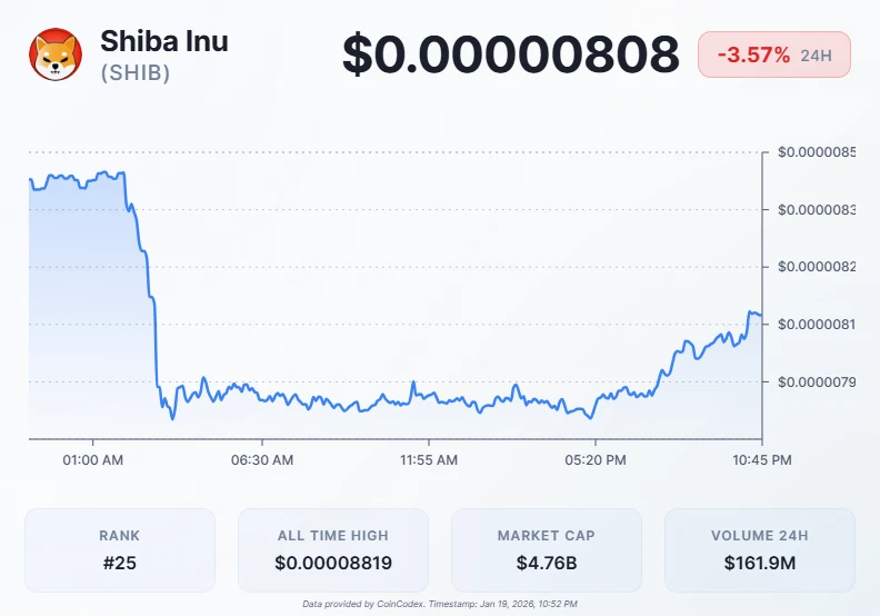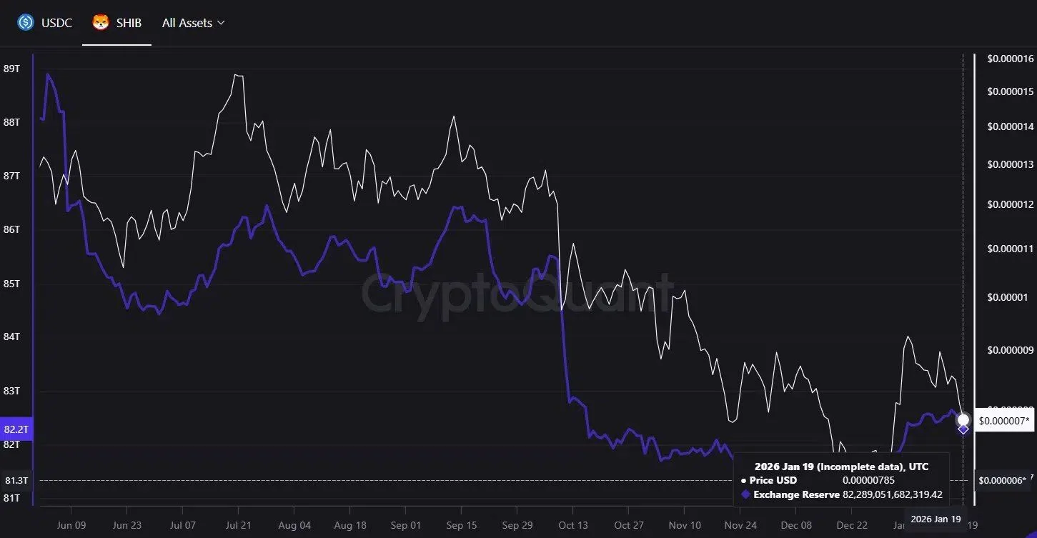 Data from CryptoQuant shows that 361,380,965,000 SHIB tokens exited centralized exchanges between January 16 and Monday. According to the platform, total exchange reserves fell from 82.642 trillion SHIB on Friday to 82.28 trillion SHIB. This reduction occurred even as Shiba Inu’s price declined over the weekend.