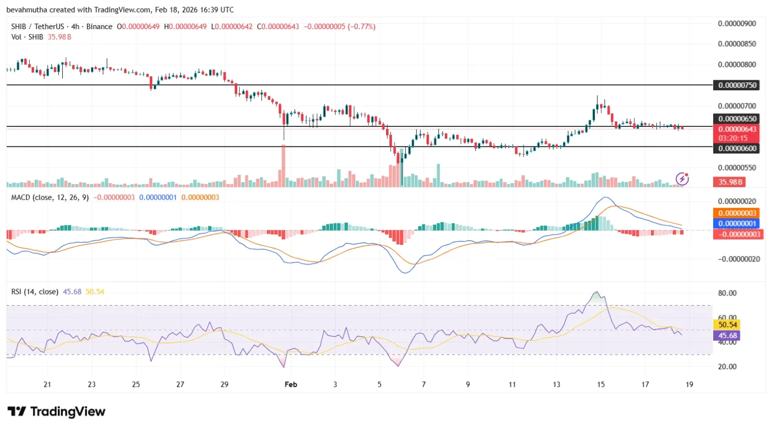 From a technical standpoint, SHIB is consolidating between established levels. Support holds near $0.00000600, while resistance sits at approximately $0.00000750. The token has been moving within this range for several days without a decisive break in either direction.