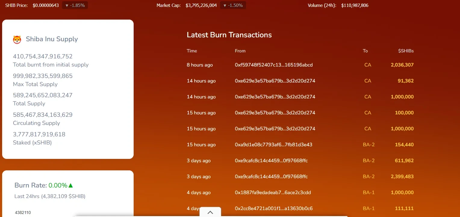 Token burns have not provided meaningful relief. Only 4,382,109 SHIB tokens were burned in the most recent 24-hour period. Given SHIB’s total circulating supply running into the hundreds of trillions, that figure is negligible.