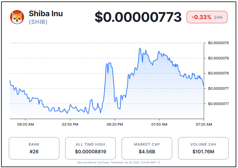 At the time of writing, SHIB trades at around $0.00000773, suggesting a 0.33% decline in the last 24 hours.