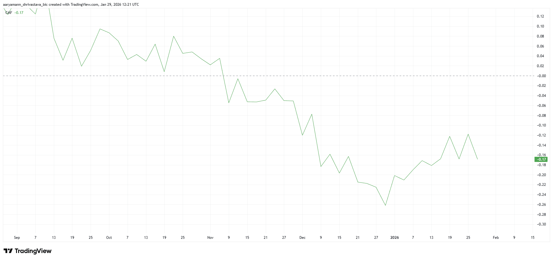 The Chaikin Money Flow indicator tracked negative throughout Q4 2025. Persistent capital outflows limited upward price attempts during that period. The metric has reversed course since January began.