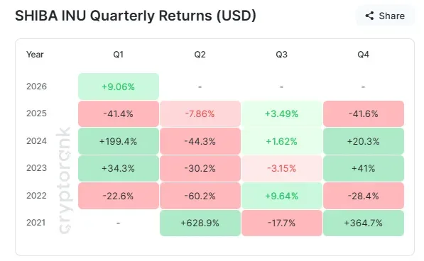 Shiba Inu has demonstrated consistent strength during the first quarter. Historical analysis reveals an average return of 35.8% during Q1 across previous years. This seasonal pattern creates a favorable environment for price appreciation in early 2026.