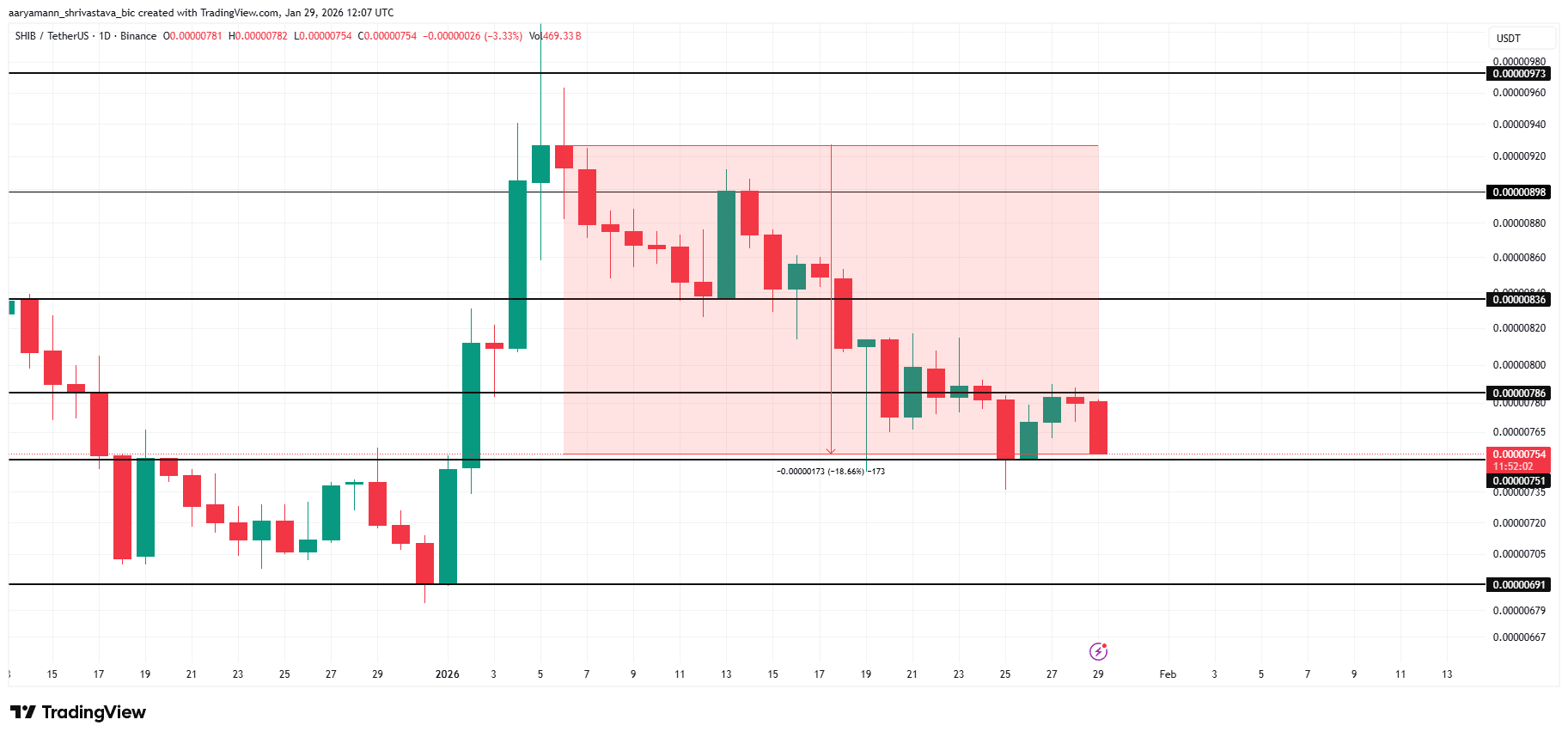 The $0.00000751 support zone remains intact. This level has preserved most of January’s gains and functions as a near-term floor. Maintaining this threshold is essential for bullish scenario development.