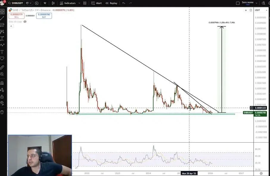 Guapeva also highlighted a long-standing descending triangle formation. This structure reflects lower highs pressing against stable support. He added that SHIB recently broke above a smaller downward trendline inside the larger triangle. Such a move often signals improving price momentum. However, he noted that continuation remains necessary for confirmation.
