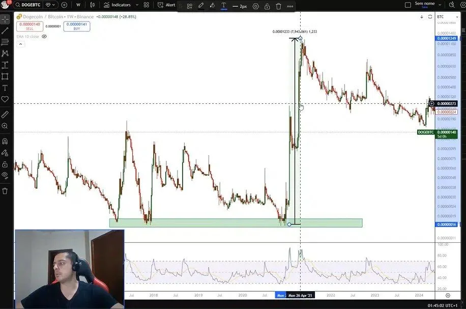 Guapeva compared Shiba Inu’s structure to DOGE/BTC price action between early 2017 and late 2021. During that period, Dogecoin held support near 0.00000016. The pair tested this level several times before breaking out. That breakout eventually triggered a surge of nearly 8,000%.
