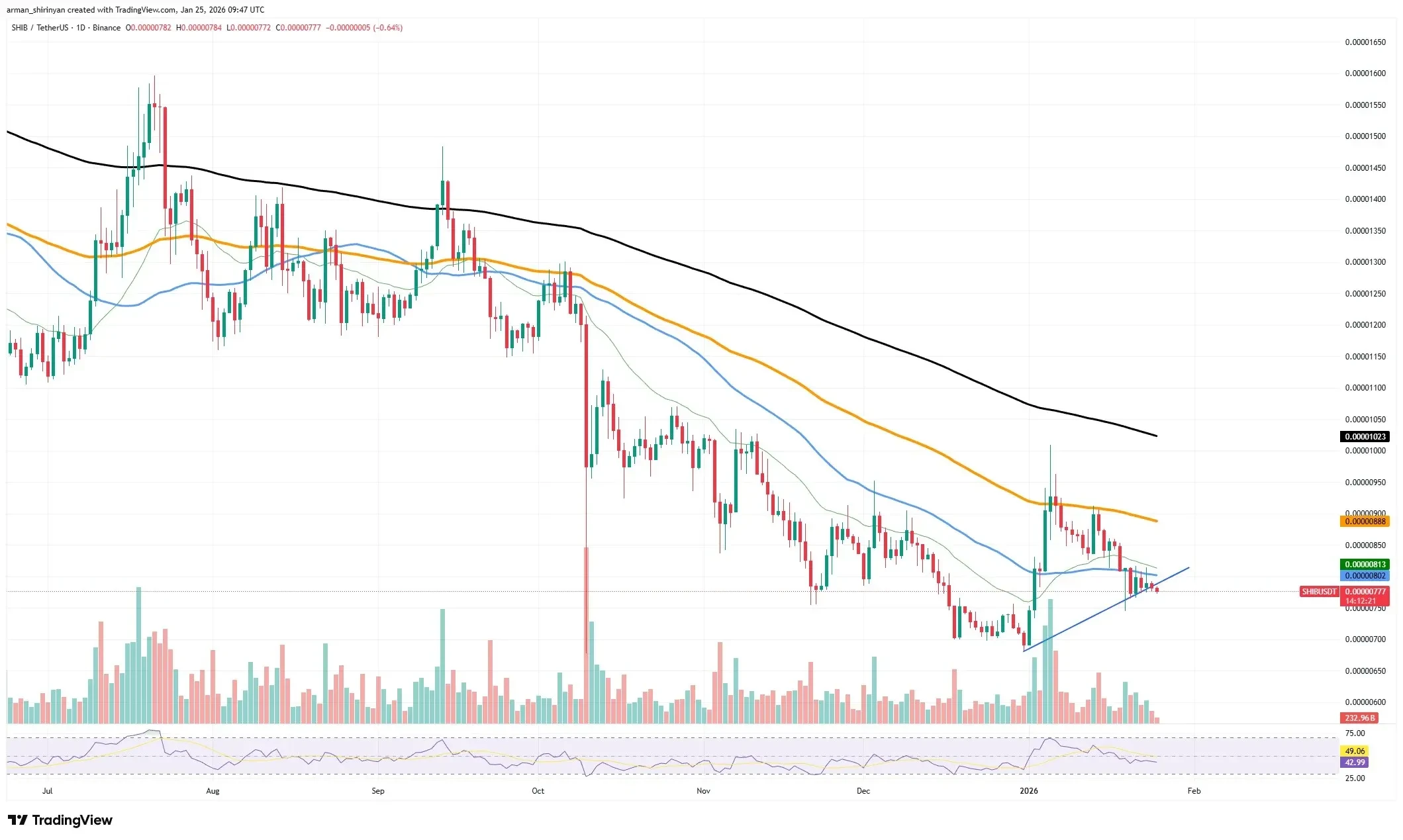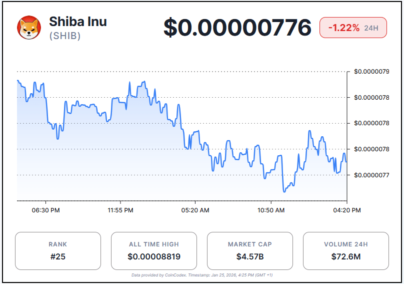 At the time of writing, SHIB trades at around $0.00000776, down 1.22% in the last 24 hours.