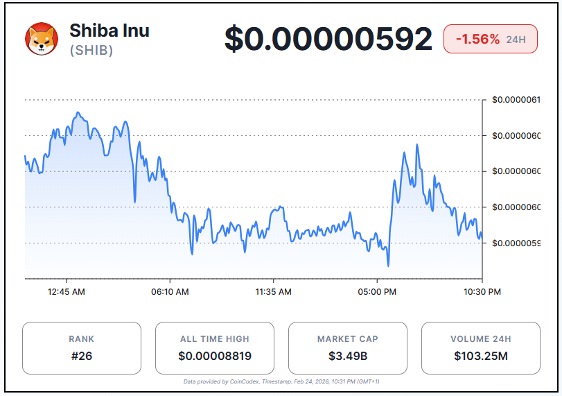 At the time of writing, Shiba Inu trades at around $0.00000592, down 1.56% in the last 24 hours.