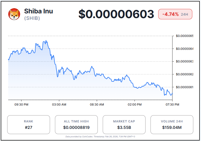 At the time of writing, Shiba Inu trades at around $0.00000603, down 4.74% in the last 24 hours. The memecoin has dropped 2.6% in the last 7 days.  Shiba Inu is down 21.2% over the last 30 days.