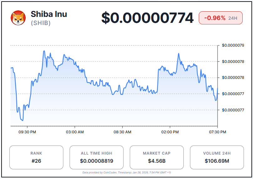 MMBTrader suggested that if Shiba Inu sustains its momentum above the support, it could trigger a bullish reversal. The analyst indicated that renewed buying and rising trading volume would confirm this trend. Based on current conditions, a rebound could drive SHIB toward $0.00001325, representing an approximate 72% gain from its current price of $0.00000774.